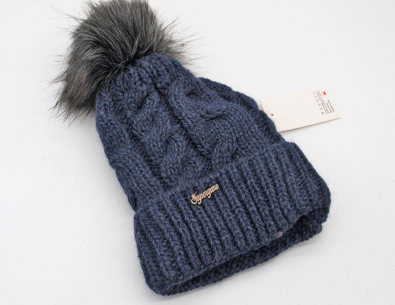 Damen Strick-Mütze gefüttert Zopfmuster Fell-Bommel Kunstfell blau