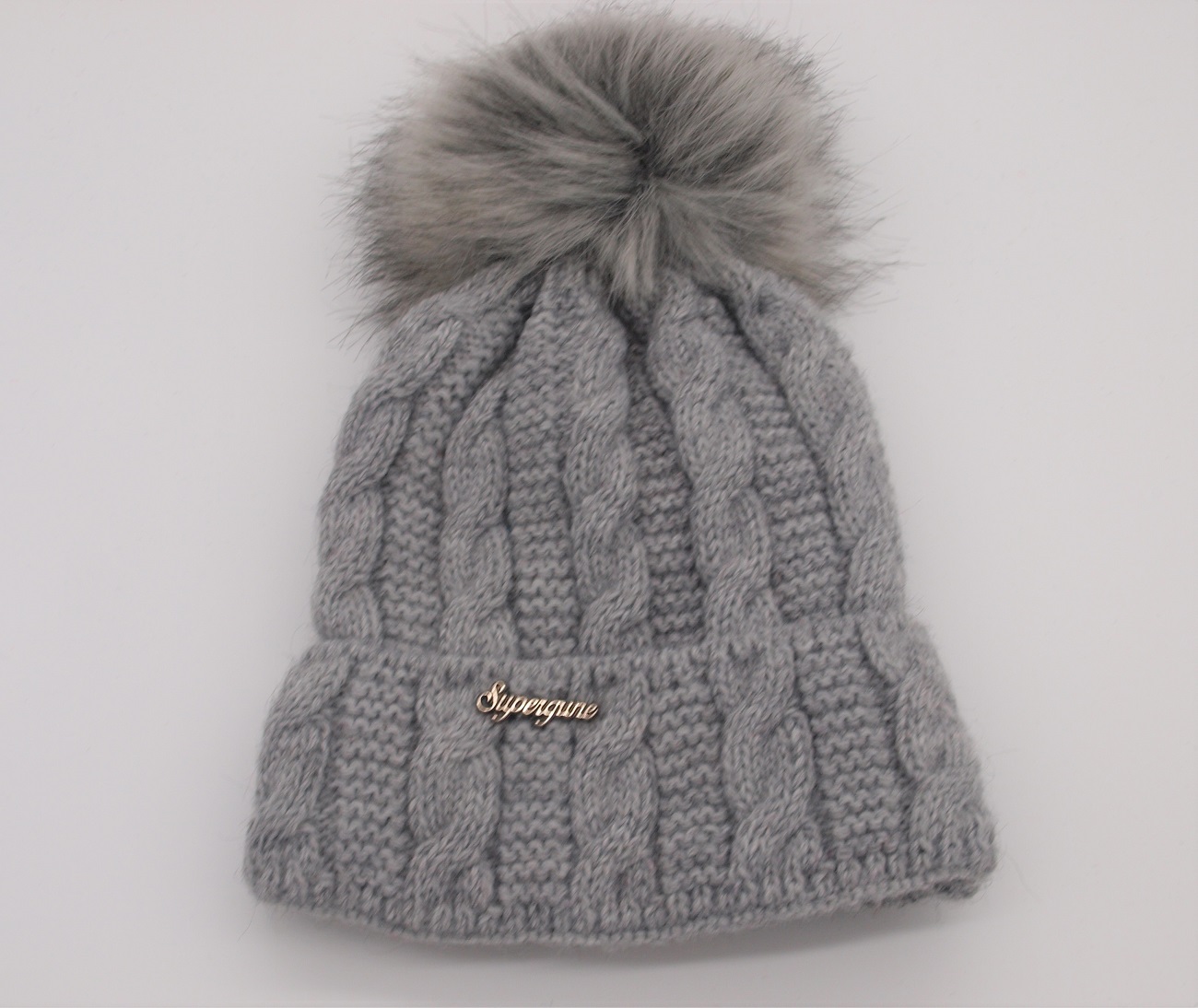 Damen Strick-Mütze gefüttert Zopfmuster Fell-Bommel Kunstfell hellgrau