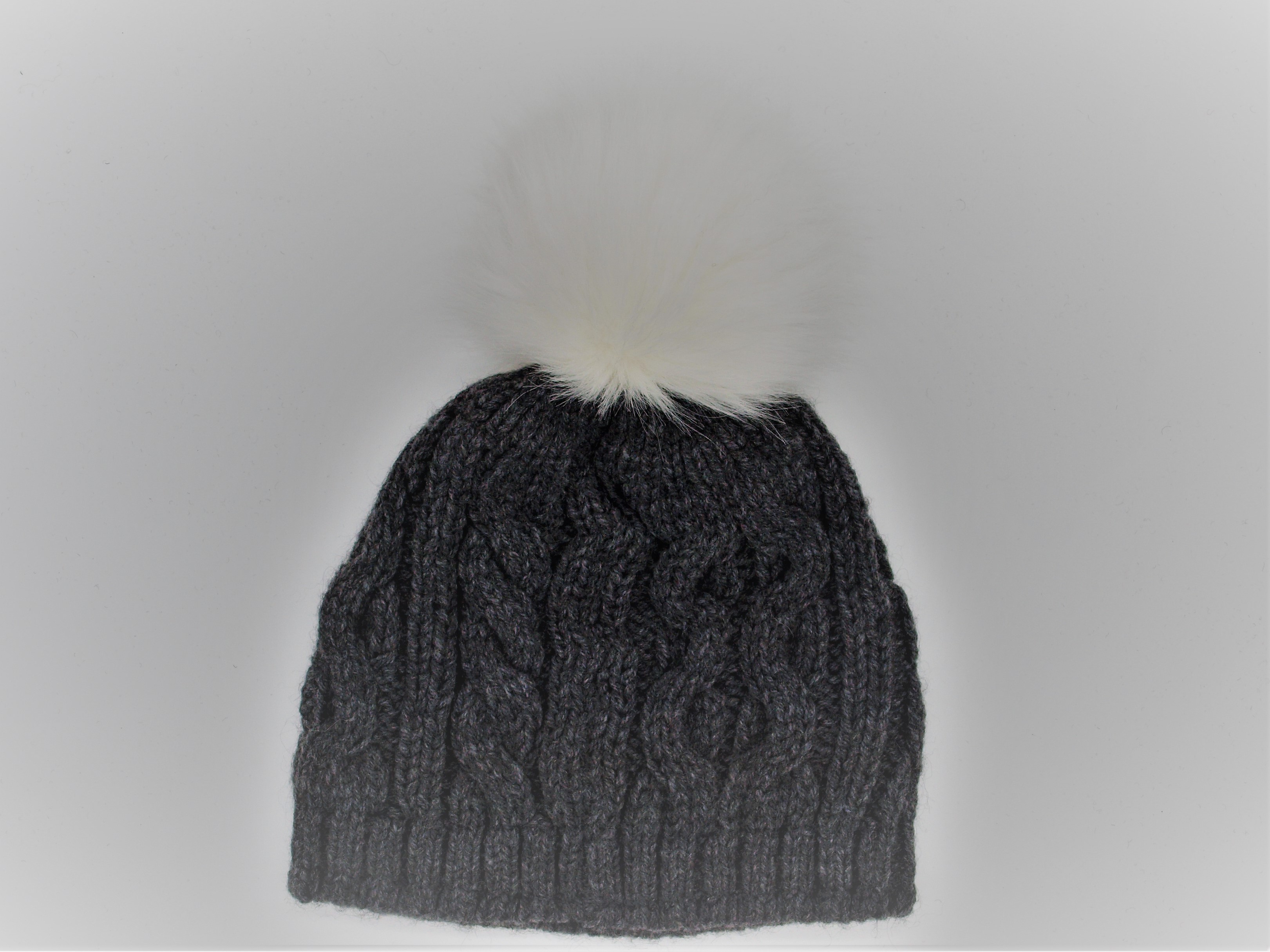 Gebeana Damen Strick-Mütze anthrazit Fell-Bommel Kunstfell, made in Germany