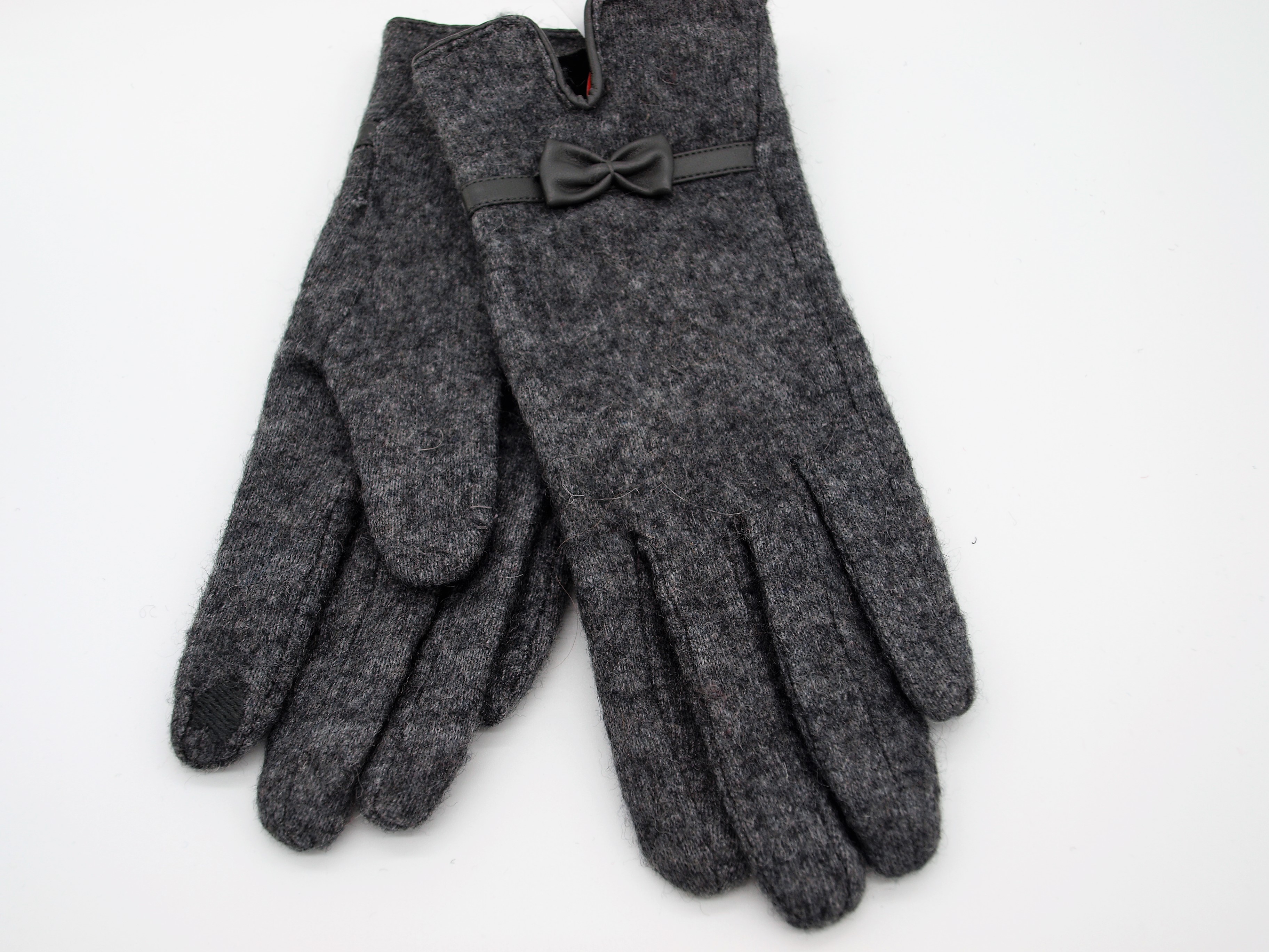 Handschuhe Strickstoff grau meliert, gefüttert touchscreen-kompatibel mit Kunstlederbesatz Schleife