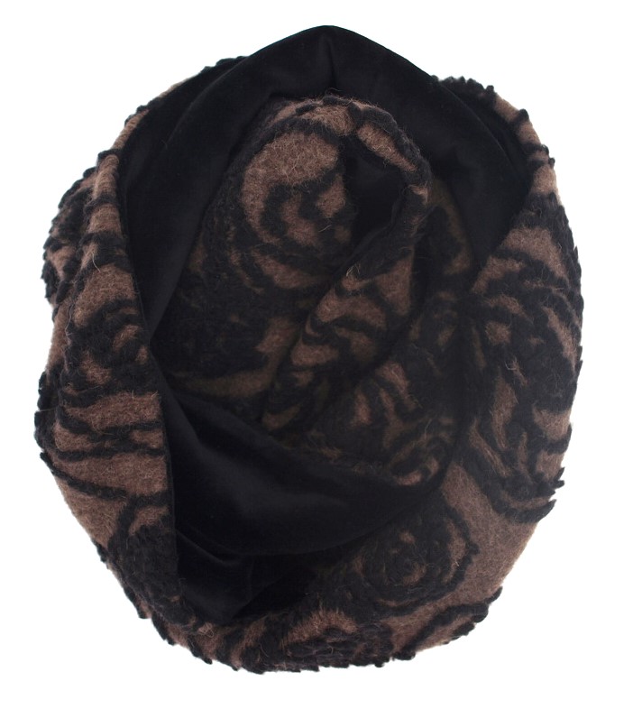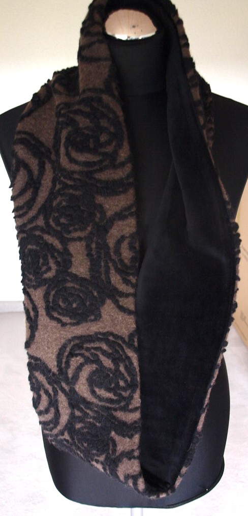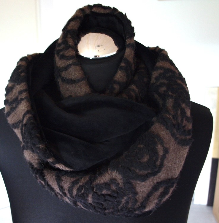 Musterwalkstoff mit schwarzem Baumwoll Nickystoff abgefüttert. Kein Jucken am Hals, sehr angenehmes Tragegefühl