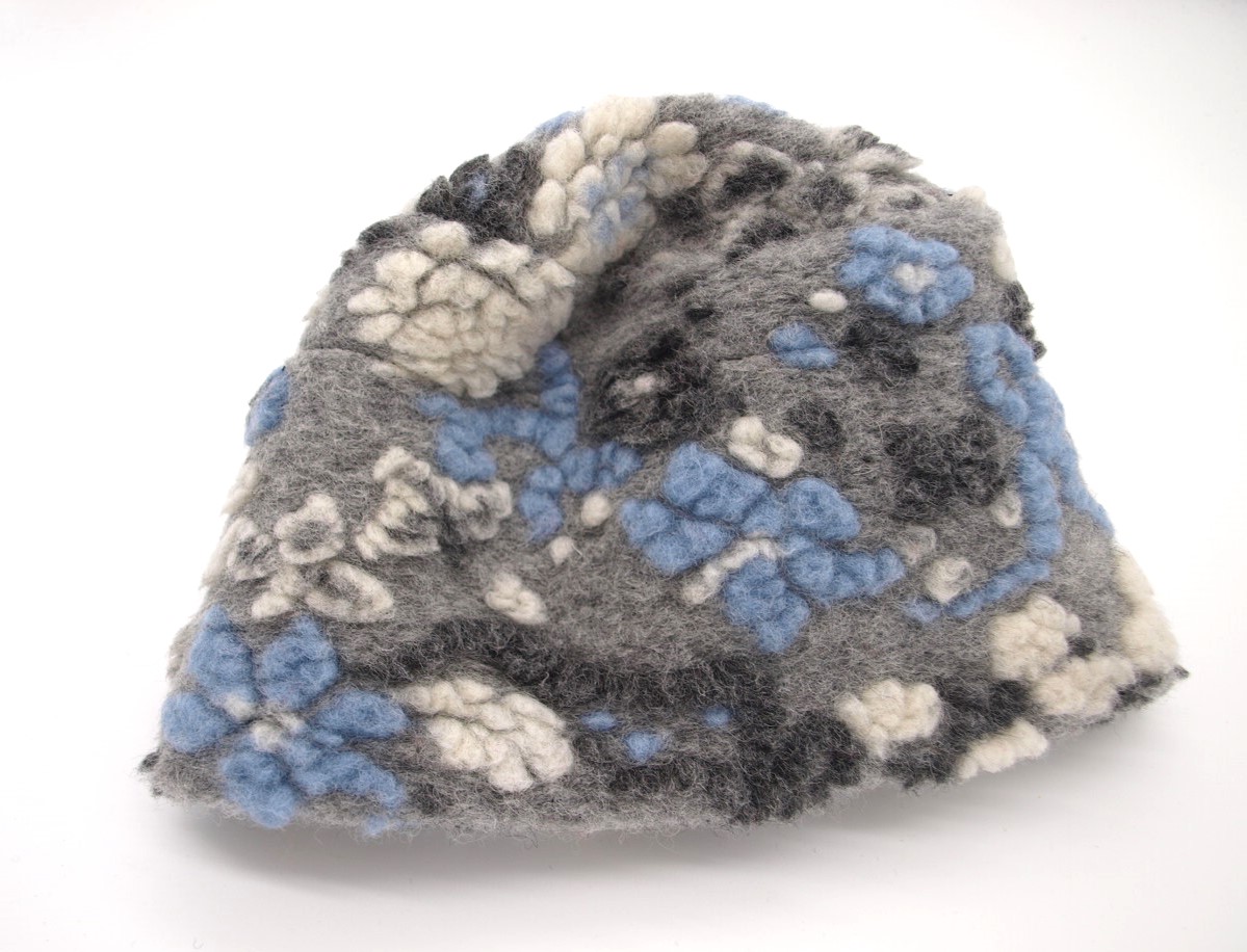 Preview: Mütze Musterwalkstoff Blumen auf hellblau Walk gefüttert handgefertigt