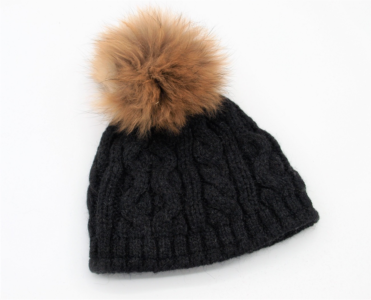 Strickmütze mit Bommel Echtpelz europäische Herstellung schwarz
